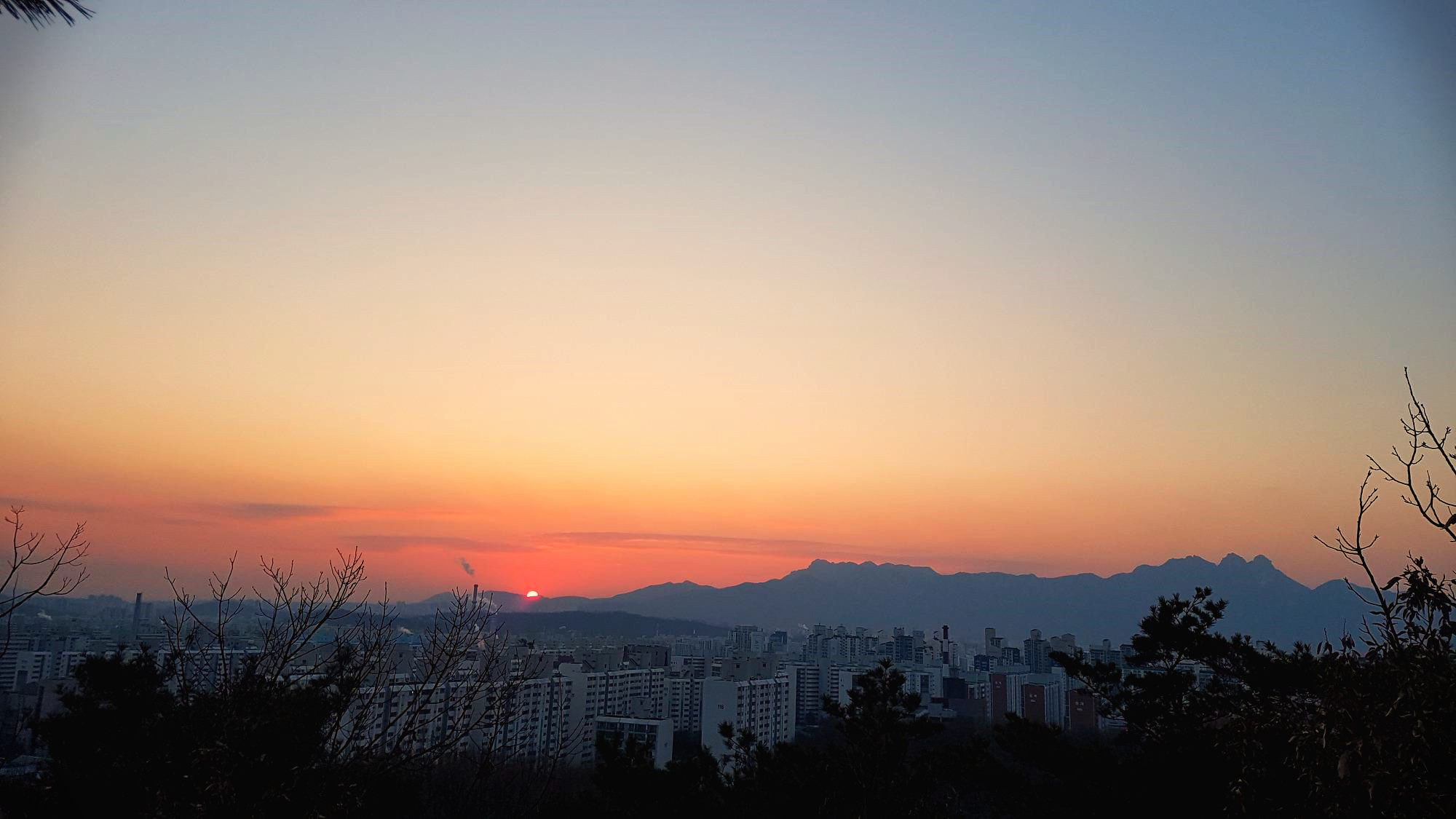 오르며 질 것이다. 석양 왼쪽에 북악산(청와대 뒷산)이 흐릿하게 보였다.